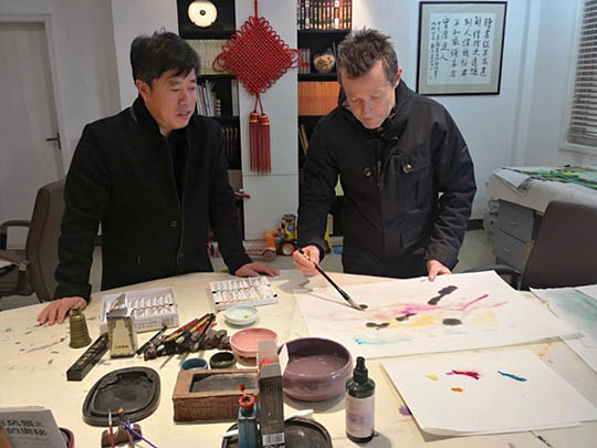 當代藝術的杰出代表、瑞士巴塞爾著名藝術家chris先生,也是首次來到中國,用他的話說,來到了三圣就有回家的感覺,一切是那么的自然、美好。他欣然在三圣畫室創(chuàng)作兩幅作品留念。